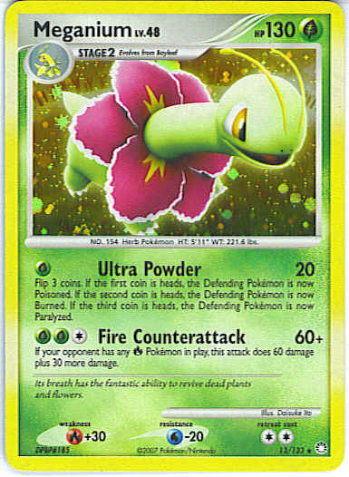 Evne [G] Ultra Powder (20) Flip 3 coins. If the first coin is heads, the Defending Pokemon is now Poisoned. If the second coin is heads, the Defending Pokemon is now Burned. If the third coin is heads, the Defending Pokemon is now Paralyzed.