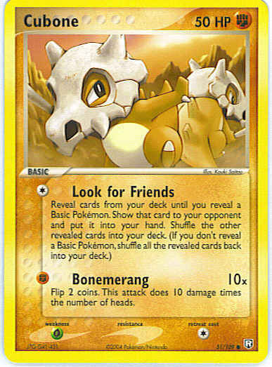 Type | Fighting | Pokemon serie | Team Rocket Returns | Stadie | Basic | HP | 50 | Sjældenhed | Common | Tilbagetrækning | 1 | Svaghed | G | Kortnummer | 51 | Evne | [C] Look for Friends - Reveal cards from your deck until you reveal a Basic Pokemon. Show that card to your opponent and put it into your hand. Shuffle the other revealed cards back into your deck. (If you don't reveal a Basic Pokemon, shuffle all the revealed cards back into your deck.) [F] Bonemerang (10x) Flip 2 coins. This attack does 10 damage times the number of heads. | Evne2 | [C] Look for Friends - Reveal cards from your deck until you reveal a Basic Pokemon. Show that card to your opponent and put it into your hand. Shuffle the other revealed cards back into your deck. (If you don't reveal a Basic Pokemon, shuffle all the revealed cards back into your deck.) [F] Bonemerang (10x) Flip 2 coins. This attack does 10 damage times the number of heads. | Kunstner | Kouki Saitou |