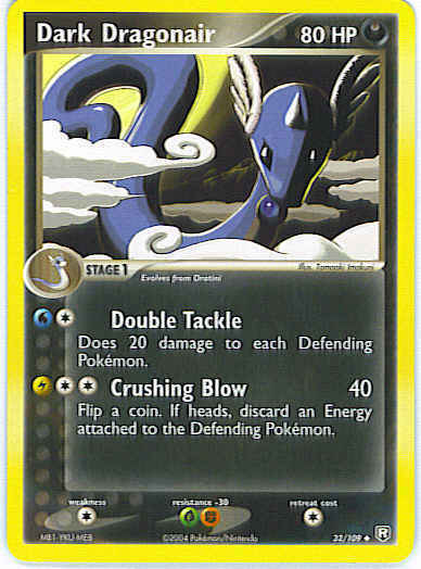 Type | Darkness | Pokemon serie | Team Rocket Returns | Stadie | Stage 1 | HP | 80 | Sjældenhed | Uncommon | Tilbagetrækning | 1 | Modstand | FG | Svaghed | C | Kortnummer | 32 | Evne | [CW] Double Tackle - Does 20 damage to each Defending Pokemon. [CCL] Crushing Blow (40) Flip a coin. If heads, discard an Energy attached to the Defending Pokemon. | Evne2 | [CW] Double Tackle - Does 20 damage to each Defending Pokemon. [CCL] Crushing Blow (40) Flip a coin. If heads, discard an Energy attached to the Defending Pokemon. | Kunstner | Tomoaki Imakuni |