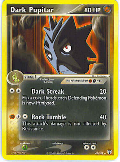 Type | Darkness Fighting | Pokemon serie | Team Rocket Returns | Stadie | Stage 1 | HP | 80 | Sjældenhed | Uncommon | Tilbagetrækning | 2 | Svaghed | G | Kortnummer | 41 | Evne | [CC] Dark Streak (20) Flip a coin. If heads, each Defending Pokemon is now Paralyzed. [CCF] Rock Tumble (40) This attack's damage is not affected by Resistance. | Evne2 | [CC] Dark Streak (20) Flip a coin. If heads, each Defending Pokemon is now Paralyzed. [CCF] Rock Tumble (40) This attack's damage is not affected by Resistance. | Kunstner | Emi Miwa |