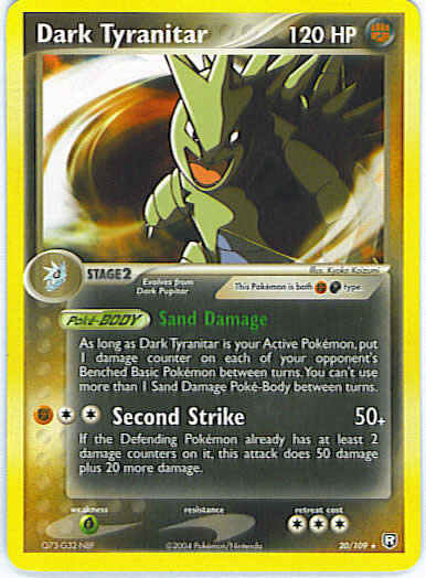 Type | Darkness Fighting | Pokemon serie | Team Rocket Returns | Stadie | Stage 2 | HP | 120 | Sjældenhed | Rare | Tilbagetrækning | 3 | Svaghed | G | Kortnummer | 20 | Evne | [CCF] Second Strike (50+) If the Defending Pokemon already has at least 2 damage counters on it, this attack does 50 damage plus 20 more damage. | Evne2 | [CCF] Second Strike (50+) If the Defending Pokemon already has at least 2 damage counters on it, this attack does 50 damage plus 20 more damage. | Kunstner | Kyoko Koizumi |
