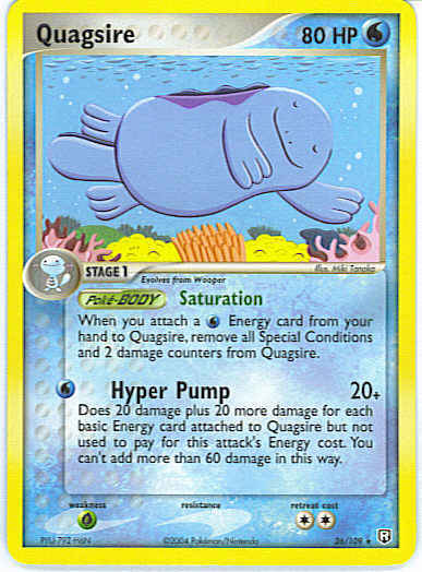 Type | Water | Pokemon serie | Team Rocket Returns | Stadie | Stage 1 | HP | 80 | Sjældenhed | Rare | Tilbagetrækning | 2 | Svaghed | G | Kortnummer | 26 | Evne | [W] Hyper Pump (20+) Does 20 damage plus 20 more damage for each basic Energy card attached to Quagsire but not used to pay for this attack's Energy cost. You can't add more than 60 damage in this way. | Evne2 | [W] Hyper Pump (20+) Does 20 damage plus 20 more damage for each basic Energy card attached to Quagsire but not used to pay for this attack's Energy cost. You can't add more than 60 damage in this way. | Kunstner | Miki Tanaka |