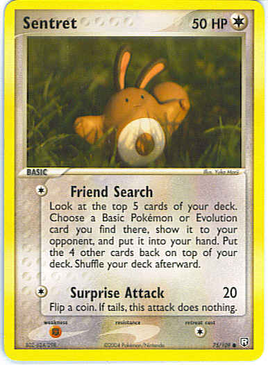 Type | Colorless | Pokemon serie | Team Rocket Returns | Stadie | Basic | HP | 50 | Sjældenhed | Common | Tilbagetrækning | 1 | Svaghed | F | Kortnummer | 75 | Evne | [C] Friend Search - Look at the top 5 cards of your deck. Choose a Basic Pokemon or Evolution card you find there, show it to your opponent, and put it into your hand. Put the 4 other cards back on top of your deck. Shuffle your deck afterward. [C] Surprise Attack (20) Flip a coin. If tails, this attack does nothing. | Evne2 | [C] Friend Search - Look at the top 5 cards of your deck. Choose a Basic Pokemon or Evolution card you find there, show it to your opponent, and put it into your hand. Put the 4 other cards back on top of your deck. Shuffle your deck afterward. [C] Surprise Attack (20) Flip a coin. If tails, this attack does nothing. | Kunstner | Yuka Morii |