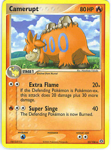 Type | Fire | Pokemon serie | Emerald | Stadie | Stage 1 | HP | 80 | Sjældenhed | Uncommon | Tilbagetrækning | 2 | Svaghed | W | Kortnummer | 23 | Evne | [CC] Extra Flame (20+) If the Defending Pokemon is Pokemon-ex, this attack does 20 damage plus 30 more damage. [CCR] Super Singe (40) The Defending Pokemon is now Burned. | Evne2 | [CC] Extra Flame (20+) If the Defending Pokemon is Pokemon-ex, this attack does 20 damage plus 30 more damage. [CCR] Super Singe (40) The Defending Pokemon is now Burned. | Kunstner | Masakazu Fukuda |