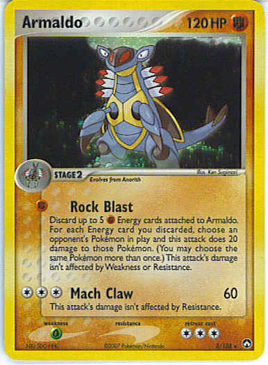 Evne [F] Rock Blast - Discard up to 5 F Energy cards attached to Armaldo. For each Energy card you discarded, choose an opponent's Pokemon in play and this attack does 20 damage to those Pokemon. (You may choose the same Pokemon more than once.) This attack's damage isn't affected by Weakness or Resistance.