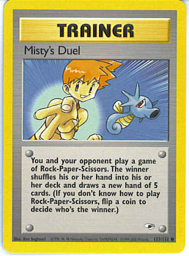 Evne You and your opponent play a game of Rock-Paper-Scissors. The winner shuffles his or her hand into his or her deck and draws a new hand of 5 cards. (If you don't know how to play Rock-Paper-Scissors, flip a coin to decide who's the winner.)