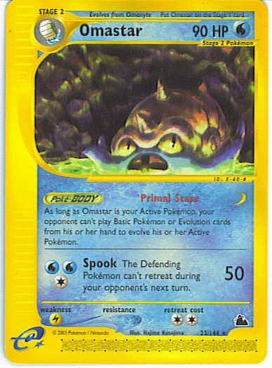 Type | Water | Pokemon serie | Skyridge | Stadie | Stage 2 | HP | 90 | Sjældenhed | Rare | Tilbagetrækning | 2 | Svaghed | L | Kortnummer | 23 | Evne | [CWW] Spook (50) The Defending Pokemon can't retreat during your opponent's next turn.