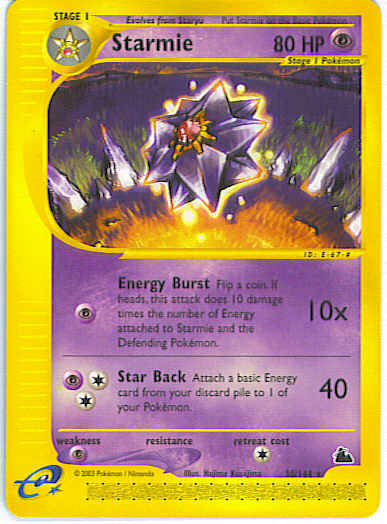 Evne2[P] Energy Burst (10x) Flip a coin. If heads, this attack does 10 damage times the number of Energy cards attached to Starmie and the Defending Pokemon.