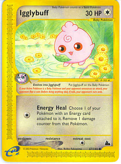 Type | Colorless | Pokemon serie | Skyridge | Stadie | Baby | HP | 30 | Sjældenhed | Common | Tilbagetrækning | 1 | Kortnummer | 67 | Evne | [C] Energy Heal - Choose 1 of your Pokemon with an Energy card attached to it. Remove 1 damage counter from that Pokemon.