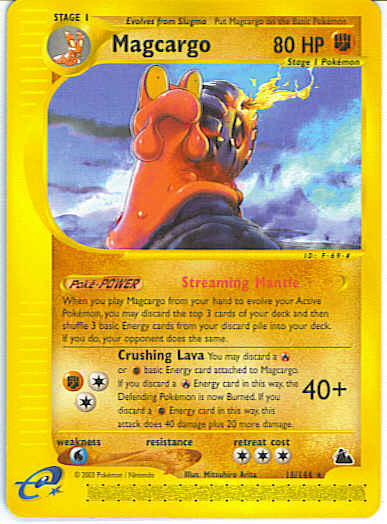 Evne[CCF] Crushing Lava (40+) You may discard a R or F basic Energy card attached to Magcargo. If you discard a R Energy card in this way, the Defending Pokemon is now Burned. If you discard a F Energy card in this way, this attack does 40 damage plus 20 more damage.