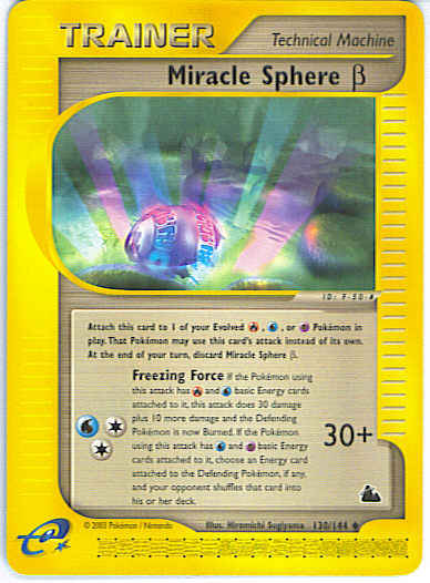 Type | Trainer | Pokemon serie | Skyridge | Stadie | Trainer (Technical Machine) | Sjældenhed | Uncommon | Kortnummer | 130 | Evne | [CCW] Freezing Force (30+) If the Pokemon using this attack has R and W basic Energy cards attached to it, this attack does 30 damage plus 10 more damage and the Defending Pokemon is now Burned. If the Pokemon using this attack has W and P basic Energy cards attached to it, choose an Energy card attached to the Defending Pokemon, if any, and your opponent shuffles that card into his or her deck.