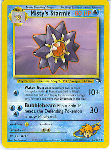 [W] Water Gun (10+) Does 10 damage plus 10 more damage for each W Energy attached to Misty's Starmie but not used to pay for this attack's Energy cost. You can't add more than 20 damage in this way.