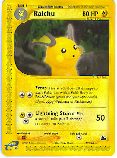 Type | Lightning | Pokemon serie | Skyridge | Stadie | Stage 1 | HP | 80 | Sjældenhed | Rare | Tilbagetrækning | 1 | Svaghed | F | Kortnummer | 27 | Evne | [CC] Zzzap - This attack does 20 damage to each Pokemon with a Poke-Body or Poke-Power (yours and your opponent's). (Don't apply Weakness or Resistance.) [CCL] Lightning Storm (50) Flip a coin. If tails, put 2 damage counters on Raichu.