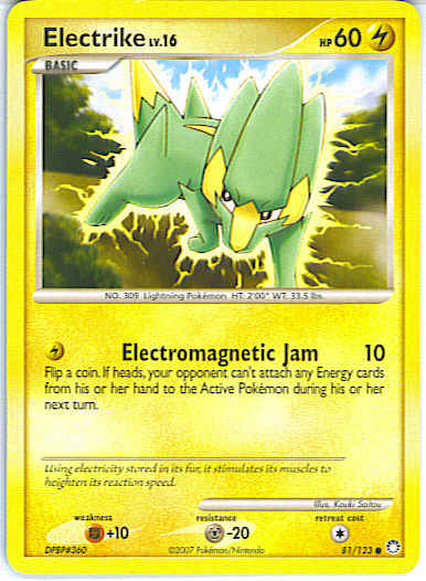 Type | Lightning | Pokemon serie | Mysterious Treasures | Stadie | Basic | HP | 60 | Sjældenhed | Common | Tilbagetrækning | 1 | Modstand | M-20 | Svaghed | F+10 | Kortnummer | 81 | Evne |