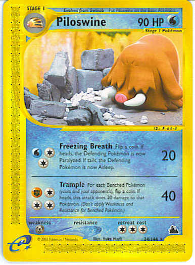 Type | Water | Pokemon serie | Skyridge | Stadie | Stage 1 | HP | 90 | Sjældenhed | Rare | Tilbagetrækning | 3 | Svaghed | M | Kortnummer | 24 | Evne | [CCW] Freezing Breath (20) Flip a coin. If heads, the Defending Pokemon is now Paralyzed. If tails, the Defending Pokemon is now Asleep. [CCCF] Trample (40) For each Benched Pokemon (yours and your opponent's), flip a coin. If heads, this attack does 20 damage to that Pokemon. (Don't apply Weakness and Resistance for Benched Pokemon.)