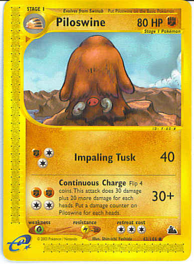 Type | Fighting | Pokemon serie | Skyridge | Stadie | Stage 1 | HP | 80 | Sjældenhed | Uncommon | Tilbagetrækning | 3 | Modstand | L | Svaghed | G | Kortnummer | 43 | Evne | [CCF] Impaling Tusk (40) [CCFF] Continuous Charge (30+) Flip 4 coins. This attack foes 30 damage plus 20 more damage for each heads. Put a damage counter on Piloswine for each heads.