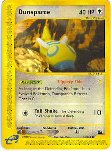 Type | Colorless | Pokemon serie | Skyridge | Stadie | Basic | HP | 40 | Sjældenhed | Common | Tilbagetrækning | 1 | Svaghed | F | Kortnummer | 53 | Evne | [C] Tail Shake (10) The Defending Pokemon is now Asleep.