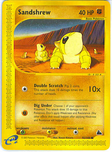 Evne | [C] Double Scratch (10x) Flip 2 coins. This attack does 10 damage times the number of heads. [F] Dig Under - Choose 1 of your opponent's Pokemon. This attack does 10 damage to that Pokemon. Don't apply Weakness and Resistance. (Any other effects that would happen after applying Weakness and Resistance still happen.)