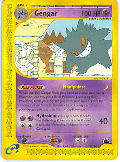 Type | Psychic | Pokemon serie | Skyridge | Stadie | Stage 2 | HP | 100 | Sjældenhed | Rare | Tilbagetrækning | 2 | Modstand | F | Svaghed | D | Kortnummer | 10 | Evne | [CCPP] Hydrokinesis (40) Flip a coin. If heads, the Defending Pokemon is now Burned. If tails, the Defending Pokemon is now Confused.