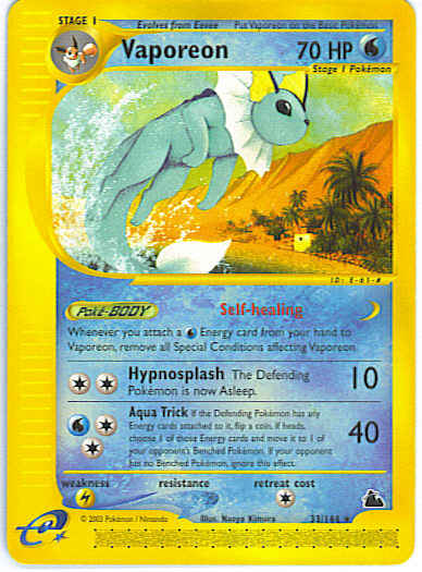 Type | Water | Pokemon serie | Skyridge | Stadie | Stage 1 | HP | 70 | Sjældenhed | Rare | Tilbagetrækning | 1 | Svaghed | L | Kortnummer | 33 | Evne | [CC] Hypnosplash (10) The Defending Pokemon is now Asleep. [CCW] Aqua Trick (40) If the Defending Pokemon has any Energy cards attached to it, flip a coin. If heads, choose 1 of those Energy cards and move it to 1 of your opponent's Benched Pokemon. If your opponent has no Benched Pokemon, ignore this effect.