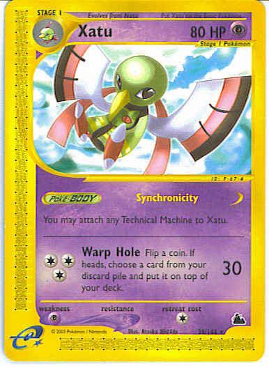 Type | Psychic | Pokemon serie | Skyridge | Stadie | Stage 1 | HP | 80 | Sjældenhed | Rare | Tilbagetrækning | 1 | Svaghed | P | Kortnummer | 35 | Evne | [CCC] Warp Hole (30) Flip a coin. If heads, choose a card from your discard pile and put it on top of your deck.
