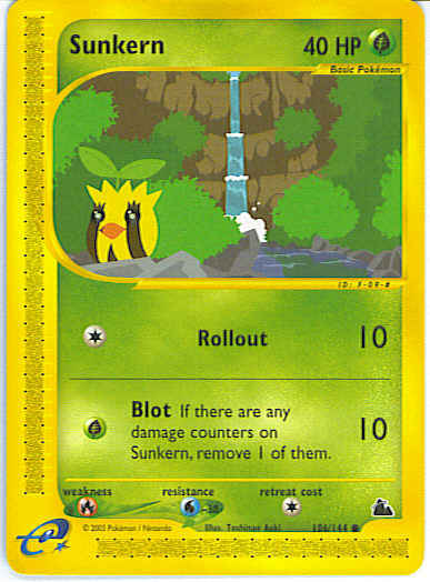Type | Grass | Pokemon serie | Skyridge | Stadie | Basic | HP | 40 | Sjældenhed | Common | Tilbagetrækning | 1 | Modstand | W | Svaghed | R | Kortnummer | 106 | Evne | [C] Rollout (10) [G] Blot (10) If there are any damage counters on Sunkern, remove 1 of them.