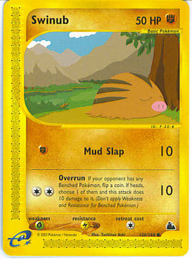 Type | Fighting | Pokemon serie | Skyridge | Stadie | Basic | HP | 50 | Sjældenhed | Common | Tilbagetrækning | 1 | Modstand | L | Svaghed | G | Kortnummer | 108 | Evne | [F] Mud Slap (10) [CC] Overrun (10) If your opponent has nay Benched Pokemon, flip a coin. If heads, choose 1 of them and this attack does 10 damage to it. (Don't apply Weakness and Resistance for Benched Pokemon.)