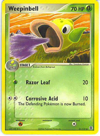 Type | Grass | Pokemon serie | Fire Red Leaf Green | Stadie | Stage 1 | HP | 70 | Sjældenhed | Uncommon | Tilbagetrækning | 1 | Svaghed | R | Kortnummer | 51 | Evne | [G] Razor Leaf (20) [CC] Corrosive Acid (10) The Defending Pokemon is now Burned. | Evne2 | [G] Razor Leaf (20) [CC] Corrosive Acid (10) The Defending Pokemon is now Burned. | Kunstner | Tomokazu Komiya |