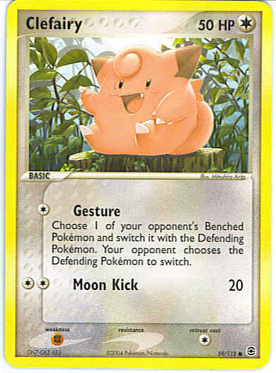 Type | Colorless | Pokemon serie | Fire Red Leaf Green | Stadie | Basic | HP | 50 | Sjældenhed | Common | Tilbagetrækning | 1 | Svaghed | F | Kortnummer | 59 | Evne | [C] Gesture - Choose 1 of your opponent's Benched Pokemon and switch it with the Defending Pokemon. Your opponent chooses the Defending Pokemon to switch. [CC] Moon Kick (20) | Evne2 | [C] Gesture - Choose 1 of your opponent's Benched Pokemon and switch it with the Defending Pokemon. Your opponent chooses the Defending Pokemon to switch. [CC] Moon Kick (20) | Kunstner | Mitsuhiro Arita |