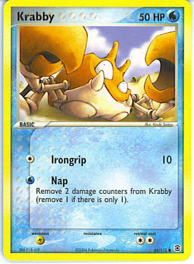 Type | Water | Pokemon serie | Fire Red Leaf Green | Stadie | Basic | HP | 50 | Sjældenhed | Common | Tilbagetrækning | 2 | Svaghed | L | Kortnummer | 66 | Evne | [C] Irongrip (10) [W] Nap - Remove 2 damage counters from Krabby (remove 1 if there is only 1). | Evne2 | [C] Irongrip (10) [W] Nap - Remove 2 damage counters from Krabby (remove 1 if there is only 1). | Kunstner | Kouki Saitou |