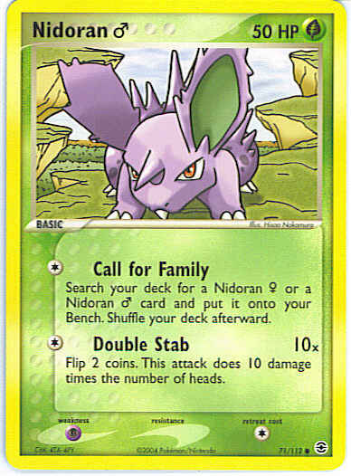 Type | Grass | Pokemon serie | Fire Red Leaf Green | Stadie | Basic | HP | 50 | Sjældenhed | Common | Tilbagetrækning | 1 | Svaghed | P | Kortnummer | 71 | Evne | [C] Call for Family - Search your deck for a Nidoran F or a Nidoran M card and put it onto your Bench. Shuffle your deck afterward. [C] Double Stab (10x) Flip 2 coins. This attack does 10 damage times the number of heads. | Evne2 | [C] Call for Family - Search your deck for a Nidoran F or a Nidoran M card and put it onto your Bench. Shuffle your deck afterward. [C] Double Stab (10x) Flip 2 coins. This attack does 10 damage times the number of heads. | Kunstner | Hisao Nakamura |