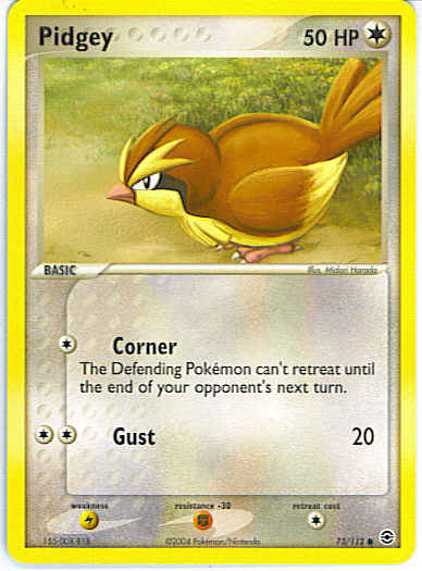 Type | Colorless | Pokemon serie | Fire Red Leaf Green | Stadie | Basic | HP | 50 | Sjældenhed | Common | Tilbagetrækning | 1 | Modstand | F | Svaghed | L | Kortnummer | 73 | Evne | [C] Corner - The Defending Pokemon can't retreat until the end of your opponent's next turn. [CC] Gust (20) | Evne2 | [C] Corner - The Defending Pokemon can't retreat until the end of your opponent's next turn. [CC] Gust (20) | Kunstner | Midori Harada |