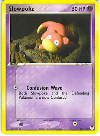 Type | Psychic | Pokemon serie | Fire Red Leaf Green | Stadie | Basic | HP | 50 | Sjældenhed | Common | Tilbagetrækning | 1 | Svaghed | P | Kortnummer | 80 | Evne | [C] Confusion Wave - Both Slowpoke and the Defending Pokemon are now Confused. | Evne2 | [C] Confusion Wave - Both Slowpoke and the Defending Pokemon are now Confused. | Kunstner | Yuka Morii |