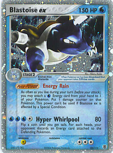 Type | Water | Pokemon serie | Fire Red Leaf Green | Stadie | Stage 2 | HP | 150 | Sjældenhed | Ultra-Rare | Tilbagetrækning | 3 | Svaghed | L | Kortnummer | 104 | Evne | [CWWW] Hyper Whirlpool (80) Flip a coin until you get tails. For each heads, your opponent discards an Energy card attached to the Defending Pokemon. | Evne2 | [CWWW] Hyper Whirlpool (80) Flip a coin until you get tails. For each heads, your opponent discards an Energy card attached to the Defending Pokemon. | Kunstner | Hikaru Koike |