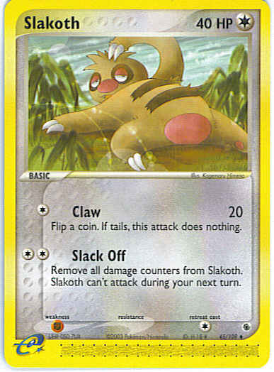 Type | Colorless | Pokemon serie | Ruby Sapphire | Stadie | Basic | HP | 40 | Sjældenhed | Uncommon | Tilbagetrækning | 1 | Svaghed | F | Kortnummer | 45 | Evne | [C] Claw (20) Flip a coin. If tails, this attack does nothing. [CC] Slack Off - Remove all damage counters from Slakoth. Slakoth can't attack during your next turn.