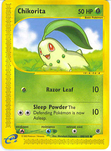 Type | Grass | Pokemon serie | Expedition | Stadie | Basic | HP | 50 | Sjældenhed | Common | Tilbagetrækning | 1 | Modstand | W | Svaghed | R | Kortnummer | 100 | Evne |