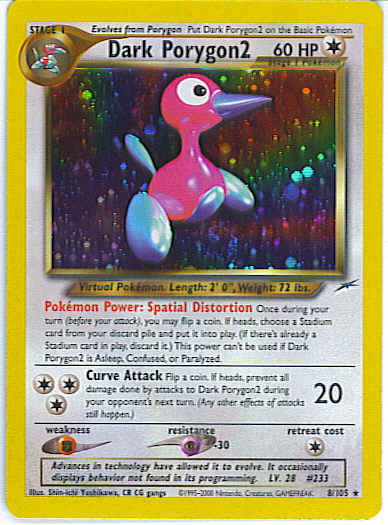 Type | Colorless | Pokemon serie | Neo Destiny | Stadie | Stage 1 | HP | 60 | Sjældenhed | Rare | Tilbagetrækning | 1 | Modstand | P | Svaghed | F | Kortnummer | 8 | Evne |