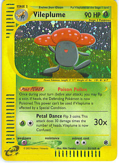Evne [CG] Petal Dance (30x) Flip 3 coins. This attack does 30 damage times the number of heads. Vileplume is now Confused.