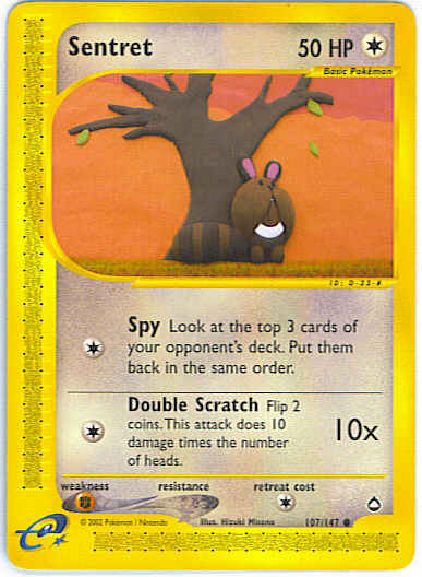 Type | Colorless | Pokemon serie | Aquapolis | Stadie | Basic | HP | 50 | Sjældenhed | Common | Tilbagetrækning | 1 | Svaghed | F | Kortnummer | 107 | Evne | [C] Spy - Look at the top 3 cards of your opponent's deck. [C] Double Scratch (10x) Flip 2 coins. This attack does 10 damage times the number of heads.