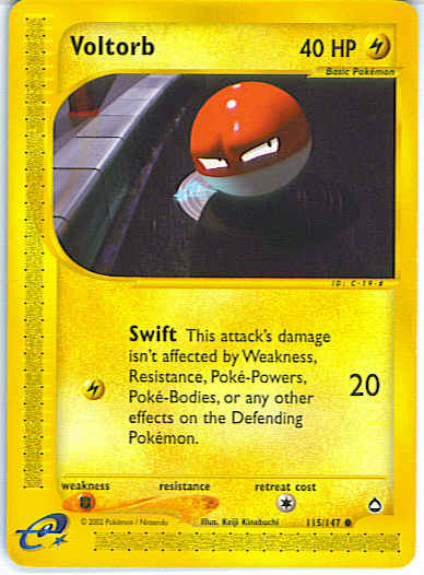 Type | Lightning | Pokemon serie | Aquapolis | Stadie | Basic | HP | 40 | Sjældenhed | Common | Tilbagetrækning | 1 | Svaghed | F | Kortnummer | 115 | Evne | [L] Swift (20) This attack's damage isn't affected by Weakness, Resistance, Poke-Powers, Poke-Bodies, or any other effects on the Defending Pokemon.