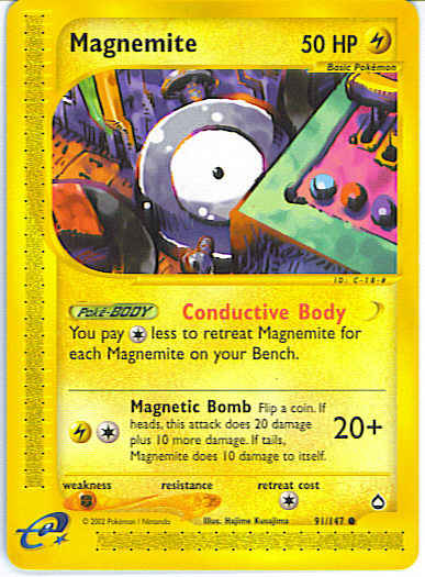 Type | Lightning | Pokemon serie | Aquapolis | Stadie | Basic | HP | 50 | Sjældenhed | Common | Tilbagetrækning | 1 | Svaghed | F | Kortnummer | 91 | Evne | [CL] Magnetic Bomb (20+) Flip a coin. If heads, this attack does 20 damage plus 10 more damage. If tails, Magnemite does 10 damage to itself.