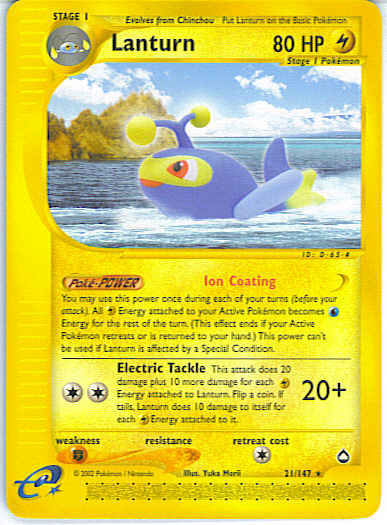 Type | Lightning | Pokemon serie | Aquapolis | Stadie | Stage 1 | HP | 80 | Sjældenhed | Rare | Tilbagetrækning | 1 | Svaghed | F | Kortnummer | 21 | Evne | [CC] Electric Tackle (20+) Count the number of L Energy cards attached to Lanturn. This attack does 20 damage plus 10 more damage for each of those Energy cards. Flip a coin. If tails, Lanturn does 10 damage to itself for each of those Energy cards.