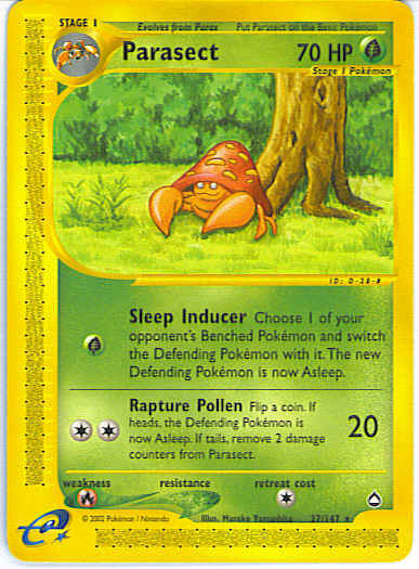 Type | Grass | Pokemon serie | Aquapolis | Stadie | Stage 1 | HP | 70 | Sjældenhed | Rare | Tilbagetrækning | 1 | Svaghed | R | Kortnummer | 27 | Evne | [G] Sleep Inducer - If your opponent has any Benched Pokemon, choose 1 of them and switch it with the Defending Pokemon. The new Defending Pokemon is now Asleep. [CC] Rupture Pollen (20) Flip a coin. If heads, the Defending Pokemon is now Asleep. If tails, remove 2 damage counters from Parasect.