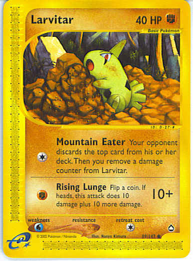 Type | Fighting | Pokemon serie | Aquapolis | Stadie | Basic | HP | 40 | Sjældenhed | Common | Tilbagetrækning | 1 | Svaghed | W | Kortnummer | 89 | Evne | [C] Mountain Eater - Discard the top card of your opponent's deck. Then, remove 1 damage counter from Larvitar. [F] Rising Lunge (10+) Flip a coin. If heads, this attack does 10 damage plus 10 more damage.