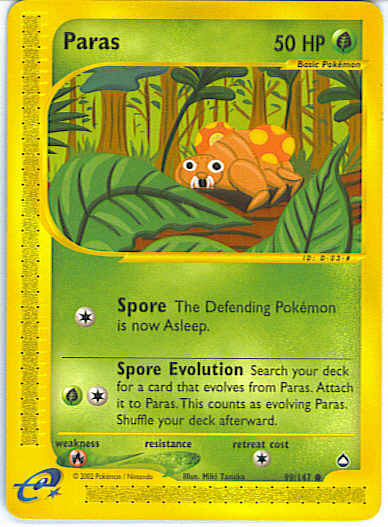 Type | Grass | Pokemon serie | Aquapolis | Stadie | Basic | HP | 50 | Sjældenhed | Common | Tilbagetrækning | 1 | Svaghed | R | Kortnummer | 99 | Evne | [C] Spore - The Defending Pokemon is now Asleep. [CG] Spore Evolution - Search your deck for a card that evolves from Paras and put that card on Paras. (This counts as evolving Paras.) Shuffle your deck afterward.