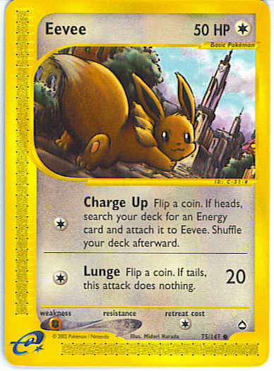 Evne2[C] Charge Up - Flip a coin. If heads, search your deck for an Energy card and attack it to Eevee. Shuffle your deck afterward.
