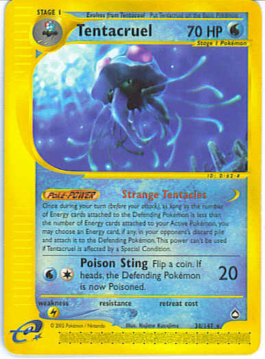 Type | Water | Pokemon serie | Aquapolis | Stadie | Stage 1 | HP | 70 | Sjældenhed | Rare | Svaghed | L | Kortnummer | 38 | Evne | [CW] Poison Sting (20) Flip a coin. If heads, the Defending Pokemon is now Poisoned.