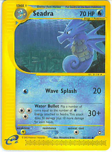 Type | Water | Pokemon serie | Aquapolis | Stadie | Stage 1 | HP | 70 | Sjældenhed | Uncommon | Tilbagetrækning | 1 | Svaghed | L | Kortnummer | 58 | Evne | [W] Wave Splash (20) [CCC] Water Bullet (30+) Flip a coin for each W Energy card attached to Seadra. This attack does 30 damage plus 10 damage for each heads.