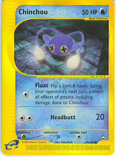 Type | Water | Pokemon serie | Aquapolis | Stadie | Basic | HP | 50 | Sjældenhed | Common | Tilbagetrækning | 1 | Svaghed | G | Kortnummer | 70 | Evne | [C] Float - Flip a coin. If heads, prevent all effects of attacks, including damage, done to Chinchou during your opponent's next turn. [CC] Headbutt (20)
