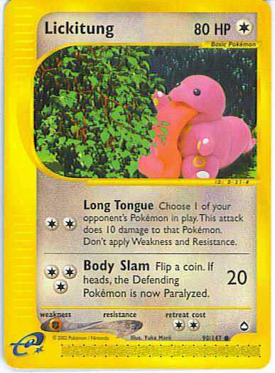 Type | Colorless | Pokemon serie | Aquapolis | Stadie | Basic | HP | 80 | Sjældenhed | Common | Tilbagetrækning | 2 | Svaghed | F | Kortnummer | 90 | Evne | [CC] Long Tongue - Choose 1 of your opponent's Pokemon. This attack does 10 damage to that Pokemon. Don't apply Weakness and Resistance. [CCC] Body Slam (20) Flip a coin. If heads, the Defending Pokemon is now Paralyzed.